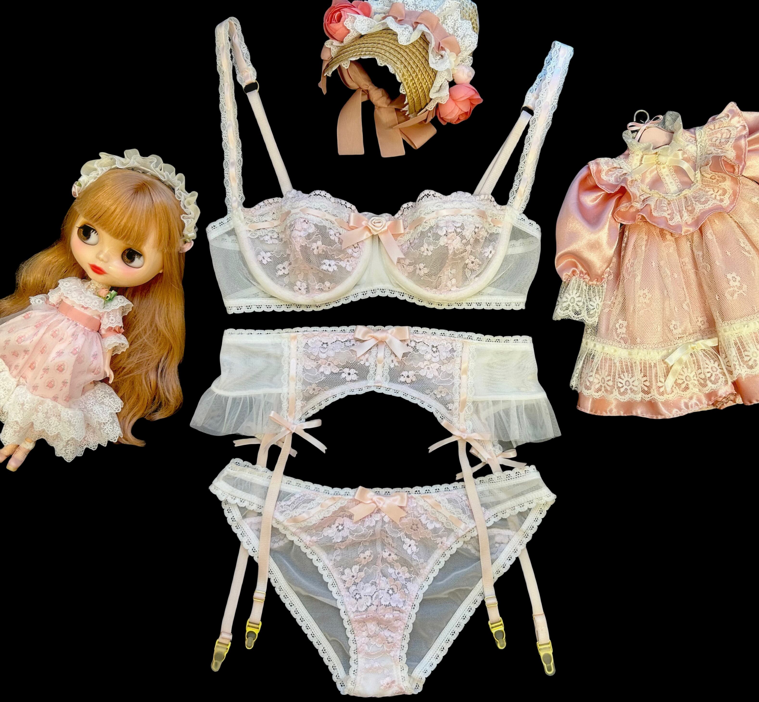 幼い頃遊んでいた着せ替え人形のドレス、アンティークのドールドレスからインスピレーションを受け、ランジェリーのデザインに詰め込みました。